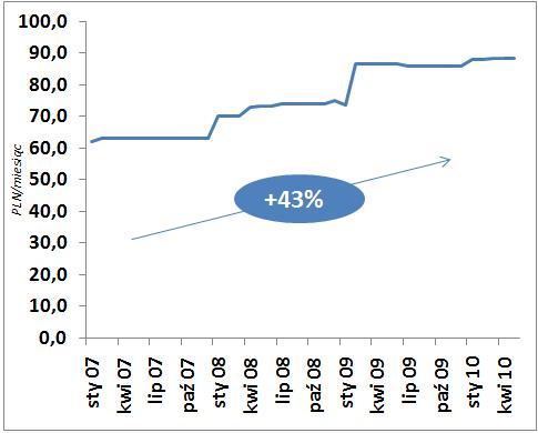 Z racji tego, że rozliczam z najemcami rachunki za media, a w szczególności za prąd, monitoruję taryfy za energię elektryczną w Warszawie. Przyjrzałem się bliżej swoim danym za okres od stycznia 2007 do maja 2010 roku. Okazało się, że koszt energii dla rodziny zużywającej średnio 150 kWh miesięcznie w tym okresie wzrósł o ponad 40%!