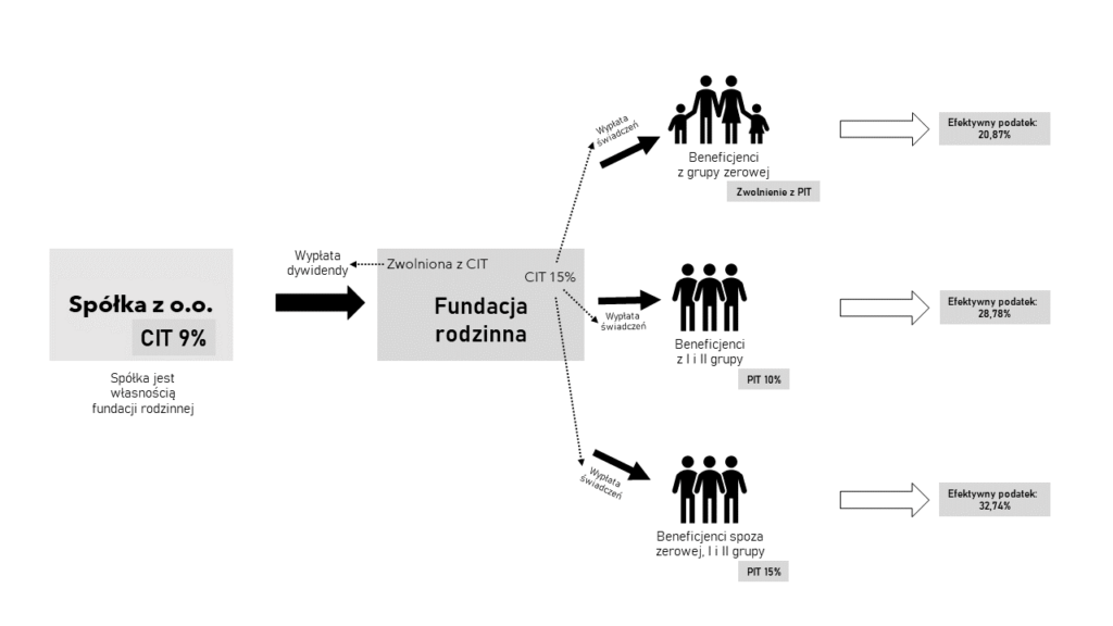Wyliczenie efektywnego podatku dla przypadku spółki z o.o. (podlegającej pod 9% CIT) należącej do fundacji rodzinnej z jednym fundatorem przy wypłacie świadczeń beneficjentom z grupy zerowej (wśród których może być także fundator) oraz beneficjentom z I i II grupy i beneficjentom spoza tych grup: