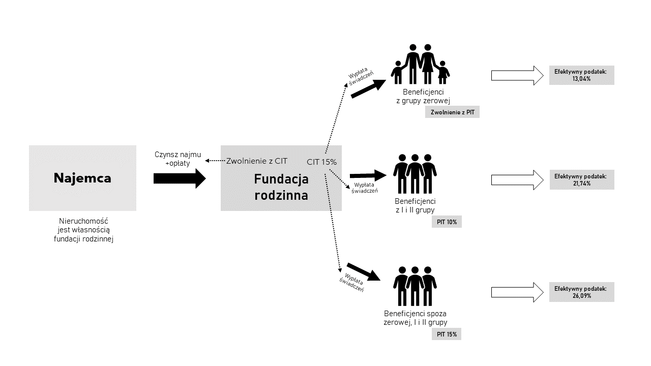 Wyliczenie efektywnego podatku dla przypadku nieruchomości wynajmowanej przez fundację rodzinną z jednym fundatorem przy wypłacie świadczeń beneficjentom z grupy zerowej (wśród których może być także fundator) oraz beneficjentom z I i II grupy oraz beneficjentom spoza tych grup: