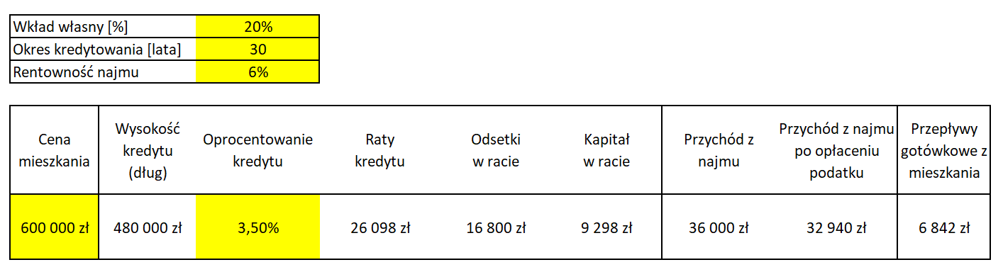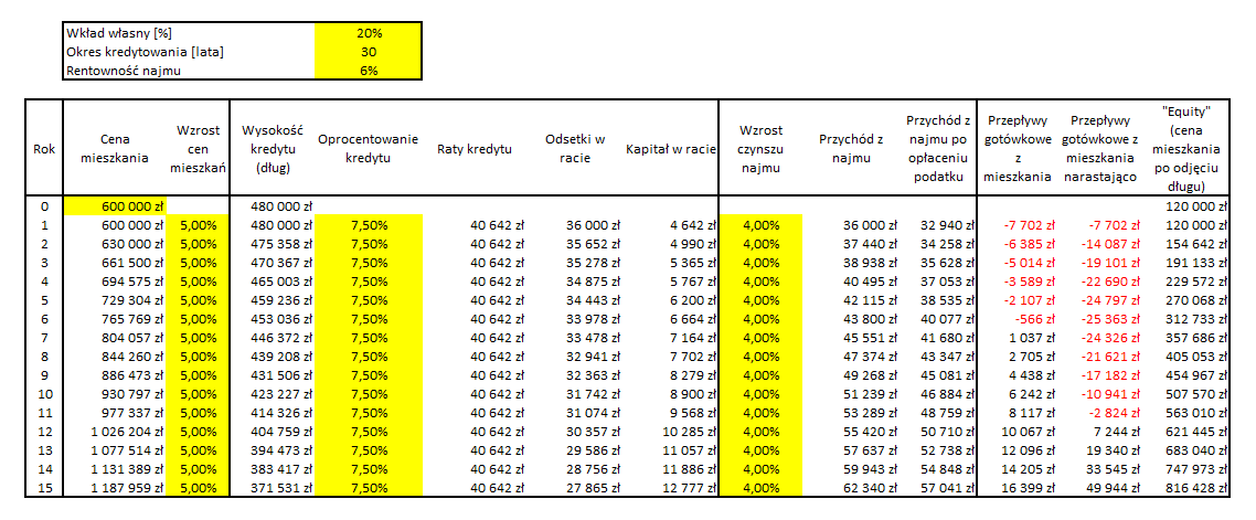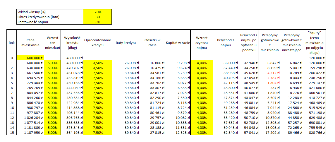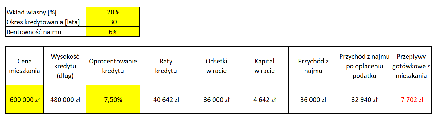 Przy zmianie oprocentowana kredytu na np. 7,5% wynajem z założoną przez nas rentownością nie zapewni nam tego, że kredyt będzie się sam spłacał. Przepływy będą ujemne.
