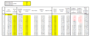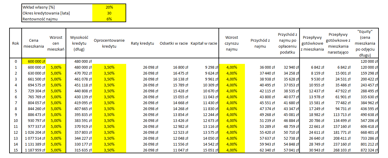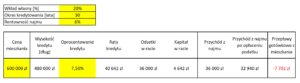 - Założenia dotyczące wkładu własnego, okresu kredytowania i rentowności najmu są takie jak poprzednio.