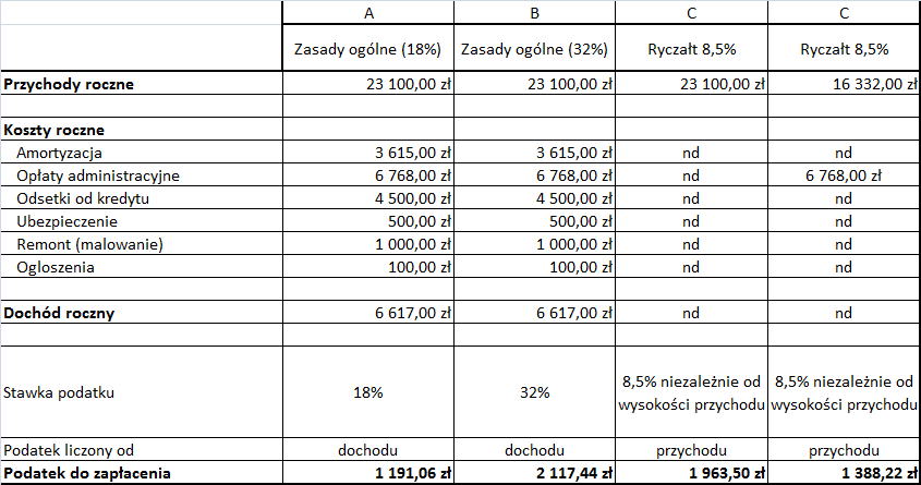 W kolumnie C policzono podatek płacony ryczałtem (stawka 8,5%). Natomiast w kolumnie D policzono podatek płacony ryczałtem, ale w sytuacji, gdy opłaty administracyjne ponosi najemca (tak więc kwoty przez niego płacone nie wliczają się do przychodu, od którego płacimy podatek).