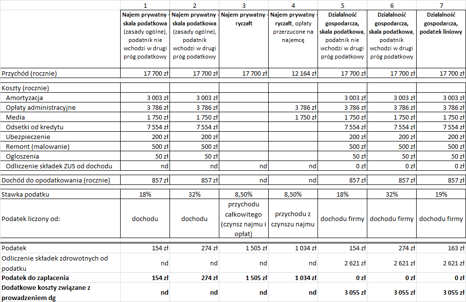 Z powyższego oszacowania wynika, że w tym konkretnym przypadku podatek do zapłacenia przy rozliczaniu najmu w ramach działalności gospodarczej będzie zerowy (bo można od podatku odliczyć składki na ubezpieczenia zdrowotne). Jeśli jednak doliczyć do tego dodatkowe koszty związane z prowadzeniem działalności gospodarczej (które przy rozliczaniu poprzez najem prywatny nie występują), to na pewno nie będzie to dobra opcja. W rezultacie z naszego oszacowania wynika, że najlepiej w tym wypadku skorzystać z rozliczenia w ramach najmu prywatnego według skali podatkowej (na zasadach ogólnych).