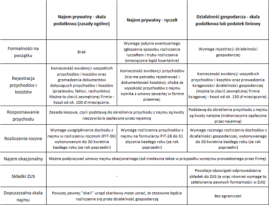 Rozliczanie poprzez najem prywatny (na zasadach ogólnych lub ryczałtem) nie oznacza zbyt wielu formalności na początku, natomiast rozliczanie najmu w ramach działalności gospodarczej wymaga zarejestrowania tej działalności.