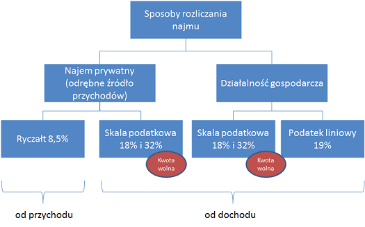 Najem prywatny rozliczamy według skali podatkowej (w 2014 roku nadal jest to 18% i 32% od dochodu) lub ryczałtem (w 2014 roku nadal obowiązuje stawka 8,5% od przychodu). Jesli wybierzemy rozliczanie w ramach działalności gospodarczej, mamy do wyboru podatek według skali podatkowej (czyli wspomniane już 18% i 32% od dochodu) oraz podatek liniowy (w 2014 roku nadal 19% od dochodu).