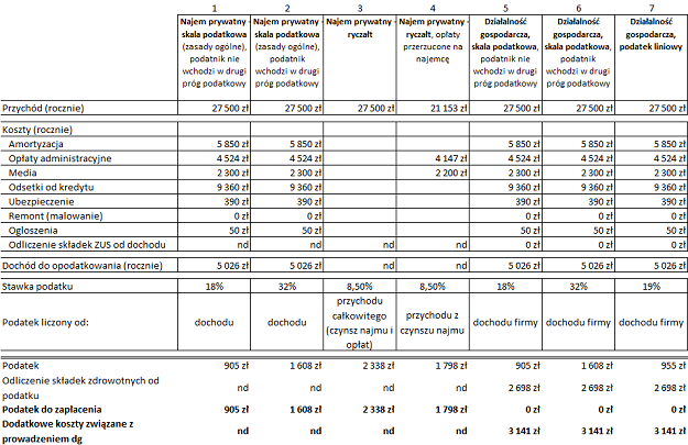 Z przykładowej tabeli powyżej wynika, że dla tego podatnika rozliczenie najmu w ramach działalności gospodarczej dałoby zerowy podatek (bo odliczylibyśmy od podatku składki na ubezpieczenie zdrowotne). Tak naprawdę jednak w tym wypadku rozliczenie przez specjalnie do tego zarejestrowaną działalność byłoby bez sensu, ponieważ doszłyby koszty związane z prowadzeniem tej działalności (one nie występują przy rozliczeniu najmu prywatnego), które przewyższają oszczędność na podatku.