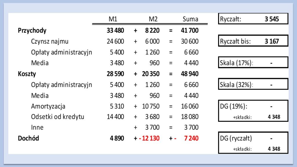 Jak widać, sumarycznie te dwa mieszkania wygenerują w 2021 roku stratę, tak więc rozliczenie podatku od dochodu będzie najsensowniejsze.